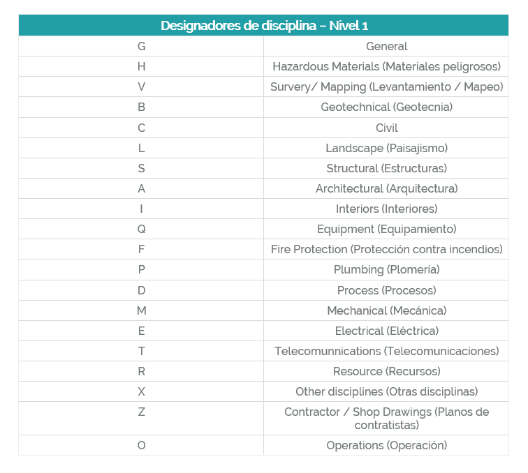 Designador de disciplina. Es el primer elemento del identificador del plano y define desde el nombre del archivo a qué especialidad corresponde la información que contiene. Puede presentarse de dos formas: