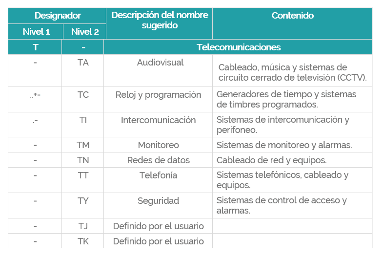 En proyectos que involucran sistemas más complejos como voz, datos, seguridad y señalización pueden requerirse planos separados para cada sistema de comunicaciones, incluso elaborados por especialistas. En estos casos, el designador de disciplina T (Telecommunications) se combina con caracteres modificadores para crear designadores de Nivel 2, como: