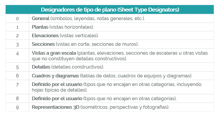 Una vez definida la disciplina, el siguiente componente es el designador de tipo de plano, representado por un carácter numérico que identifica el tipo de información gráfica presentada.