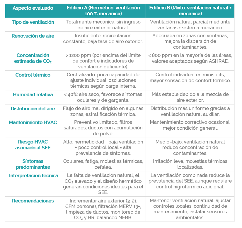 Los edificios herméticos sin ventilación natural o sin control ambiental adecuado presentan mayor prevalencia de SEE, mientras que aquellos con mezcla de ventilación natural y mecánica ofrecen mejores condiciones de bienestar.