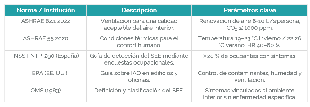 b) Edificio permanentemente enfermo: en este caso los síntomas se siguen mostrando durante años. Suelen estar asociados a deficiencias de las instalaciones fijas como por ejemplo iluminación, climatización y ventilación. La siguiente tabla presenta un resumen de las principales normas y guías que abordan este fenómeno.