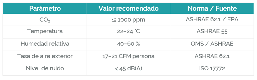 - Químicos: compuestos orgánicos volátiles (COVs), ozono, formaldehído, CO₂ elevado.
