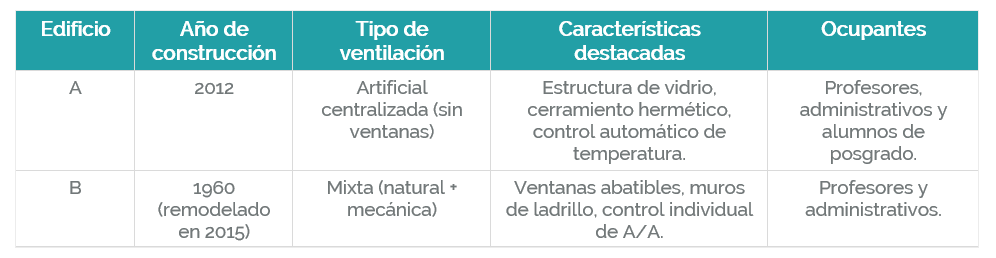 El estudio se realizó en una dependencia de educación superior ubicada, Tamaulipas. Se seleccionaron dos edificios con características constructivas y de operación distintas como se puede observar en la siguiente tabla: