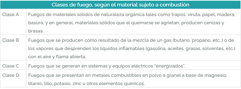Los extintores se seleccionan de acuerdo con las diferentes clases de fuego. Los fuegos de clase A corresponden a materiales sólidos de naturaleza orgánica como papel, madera, trapos o viruta. Los de clase B se generan por líquidos inflamables o gases, como gasolina, aceites, grasas, butano o propano. Los de clase C se presentan en equipos o sistemas eléctricos, mientras que los fuegos de clase D corresponden a metales combustibles como magnesio, titanio, litio o potasio.