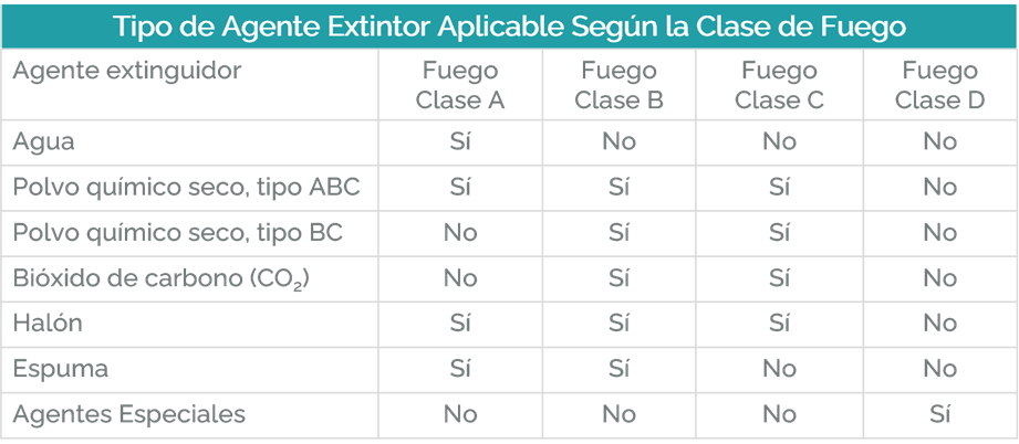 En función del tipo de fuego, se determina el tipo de extintor a utilizar. En oficinas es común el uso de extintores tipo ABC, mientras que en instalaciones industriales se emplean agentes especiales para fuegos clase D.